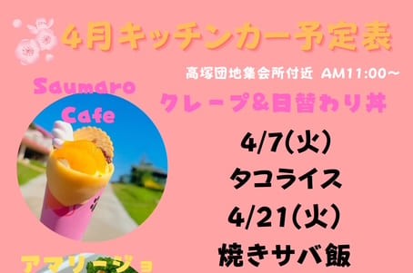 4月キッチンカー出店 イベント 2026.03.30 キッチンカー4月出店ダウンロード 関連リンク集です。 Saumaro Cafe(サウマロカフェ) Instagram / X Kitchentruck Amarillo(アマリージョ) Instagram / X SnowKotan(スノーコタン) Web / Instagram / X
